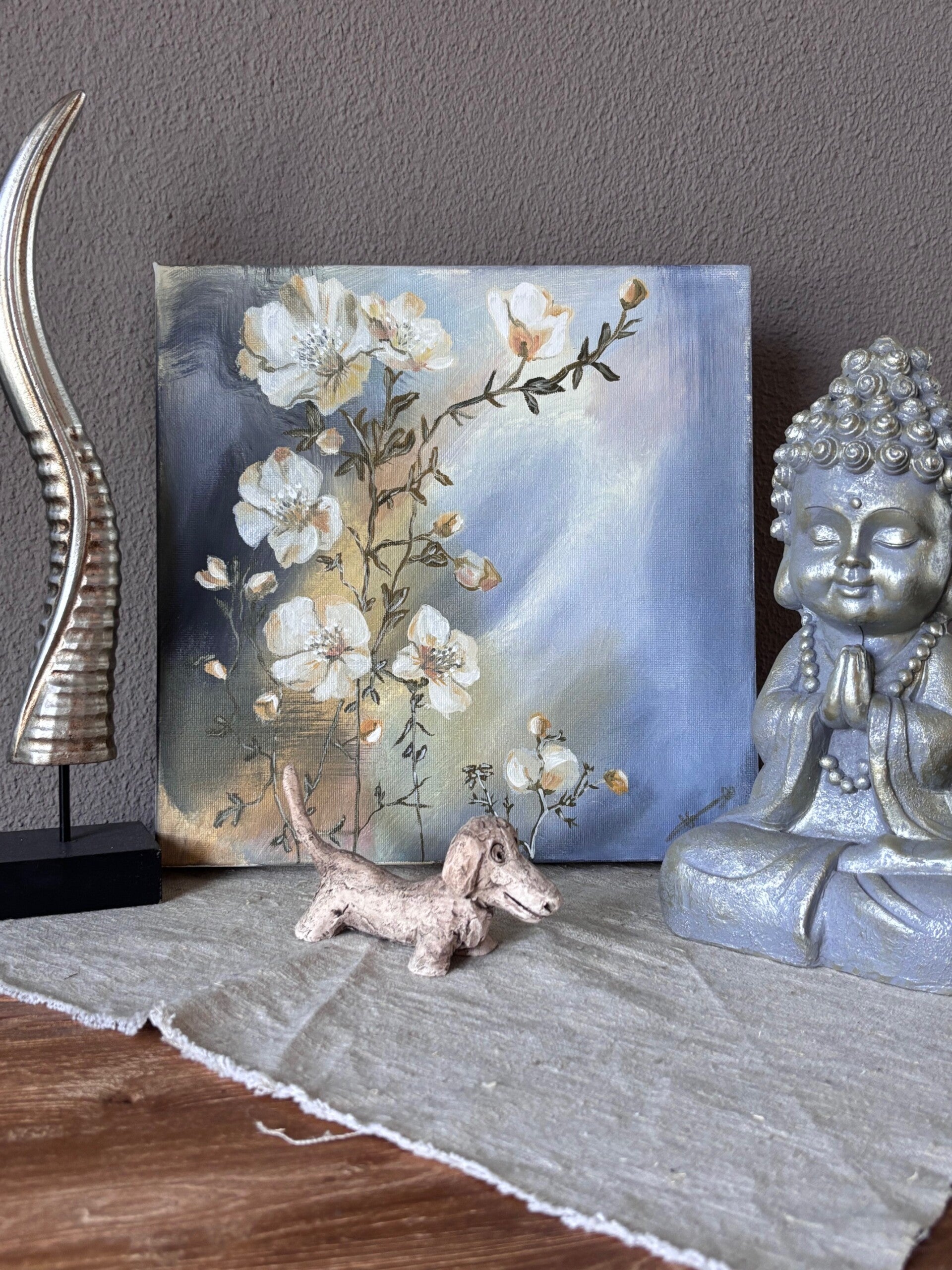 "Whispers of Spring" offers a moment of quiet clarity. Gentle white blossoms reach upward against a shifting background of misty blues, soft gold and stormy greys — like petals glowing through morning haze. The composition balances airiness with intimacy, painted in a subtle, layered technique.