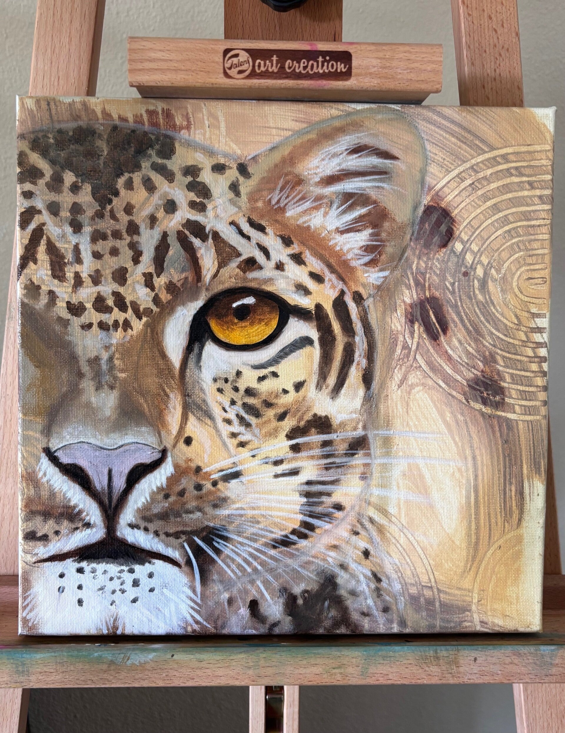 "Eye of the Hunter" vangt de stille spanning tussen rust en instinct. De gouden blik van het luipaard dringt diep door en nodigt je uit in een wereld waar wilde elegantie en oeroude patronen samenkomen. De textuur op de achtergrond ademt ritme en ritueel, en versterkt de aanwezigheid van dit majestueuze dier.