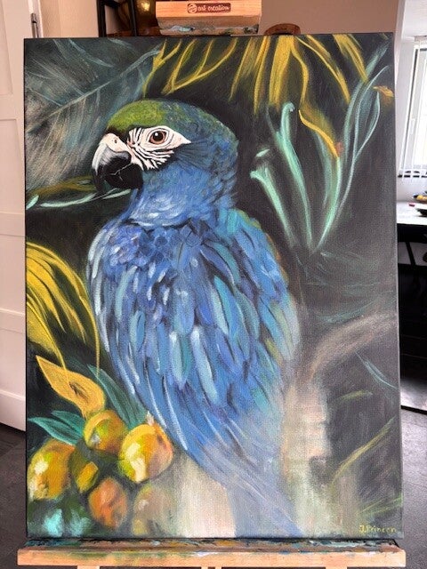 Laat je meevoeren naar een tropische droomwereld, waar een majestueuze blauwe papegaai stilletjes tussen gouden palmen en rijp fruit zit. Among Golden Palms is een expressief acrylschilderij op doek, dat de kracht en rust van de natuur vangt in diepe, rijke kleuren. De doordringende blik van de vogel en de levendige textuur van zijn veren vormen een krachtig contrast met het zachte, gouden bladerdek op de achtergrond.