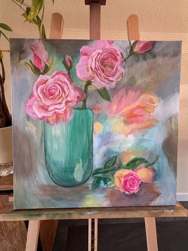 In Quiet Light is een zachte bloemcompositie die romantisch detail combineert met licht en zachtheid. De zachtroze rozen zijn sierlijk geschikt in een doorschijnende turquoise vaas, omringd door een fluistering van abstracte kleuren. Tinten van koraal, lila en blauwgroen geven het geheel een dromerige gloed.