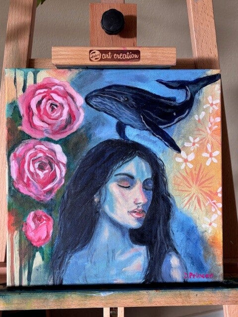 Een vrouwelijk silhouet straalt serene overgave uit, gedragen door de diepe stilte van de oceaan. Boven haar zweeft een walvis — symbool van intuïtie, rust en een diepe verbondenheid met de natuur. Om haar heen bloeien rozen en dansen bloemen als herinnering aan zachte kracht.