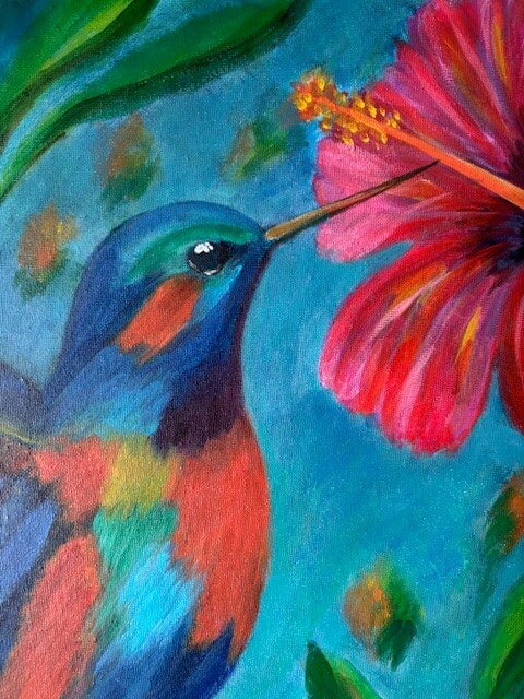 Een kolibrie zweeft sierlijk in de lucht, aangetrokken door een uitbundige hibiscusbloem. Het felle kleurgebruik geeft het schilderij een speelse en levendige uitstraling, terwijl de beweging van de vleugels de vrijheid van de natuur weerspiegelt.